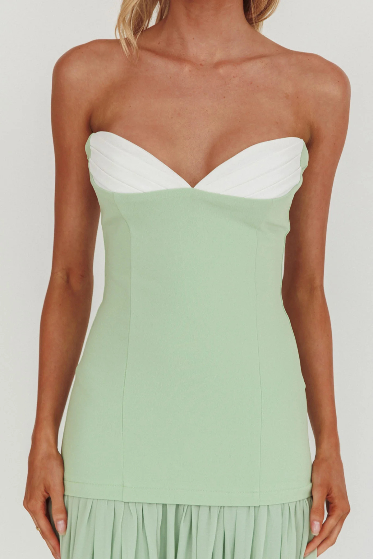 Turn heads effortlessly in the Amalfi Dress, a stunning strapless maxi that’s all about understated elegance. Crafted in a soft mint hue, it features a contrasting sweetheart neckline, a beautifully flowy sheer skirt, and a delicate lining for just the right amount of coverage.