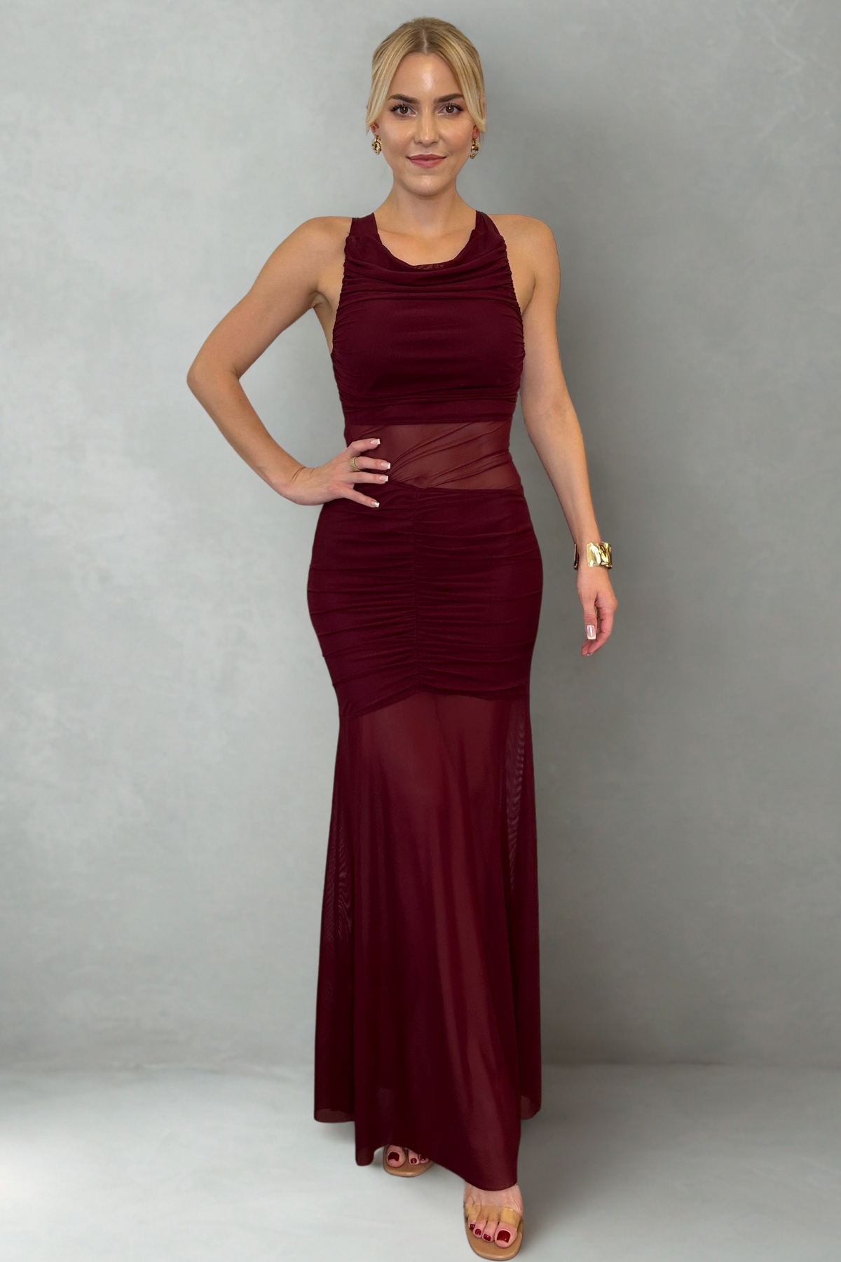 Daring and dreamy, the Luna Dress is your go-to statement piece for evening glam. Designed in Australia, this figure-hugging maxi features a mix of sheer and double-layered mesh for the perfect balance of allure and elegance. Ruching details and a striking open back with criss-cross straps add the final wow factor.