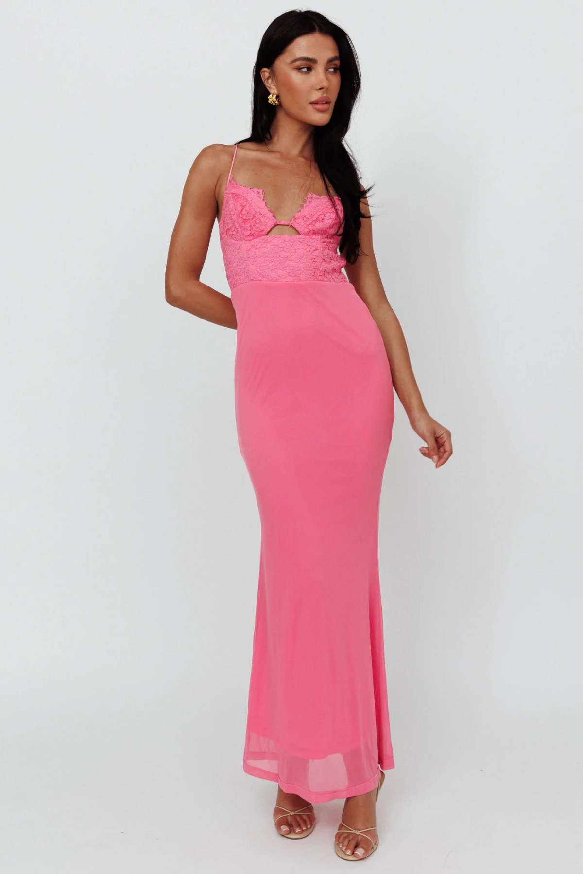 Turn heads in our Pink Temptation maxi dress — the ultimate showstopper for your next special occasion. Featuring a delicate lace bodice, flowing mesh overlay, and an eye-catching strappy tie-up back, this gown is all about feminine elegance with a sultry twist. Fully lined for a flawless fit and finished with an invisible back zipper, it’s the perfect choice when all eyes should be on you.